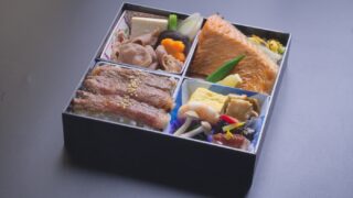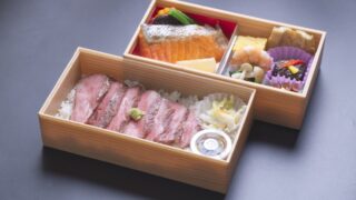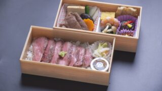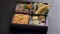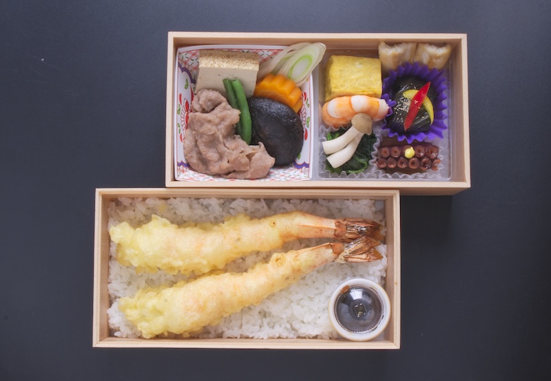 食べがいのある大きな海老天麩羅2本と牛すき焼きのリッチ感ある二段重
