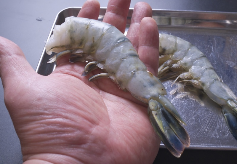 横幅約20センチの弁当箱いっぱいに横たわる大きさの海老が2本です。