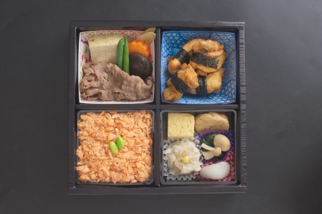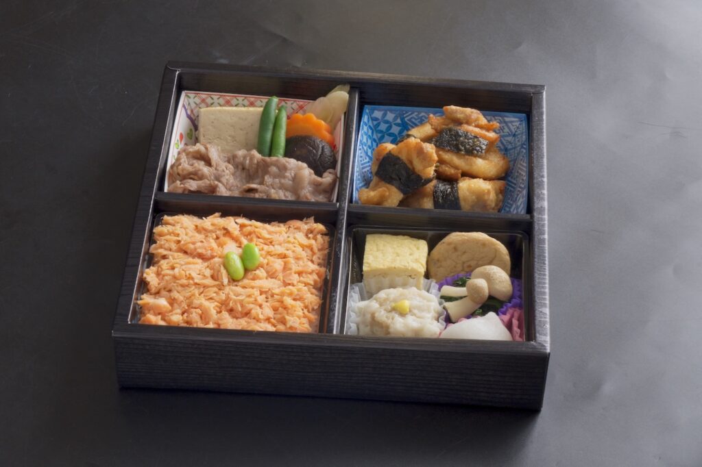 - 副菜/卵焼き、がんも、ほうれん草、甘味団子、焼売